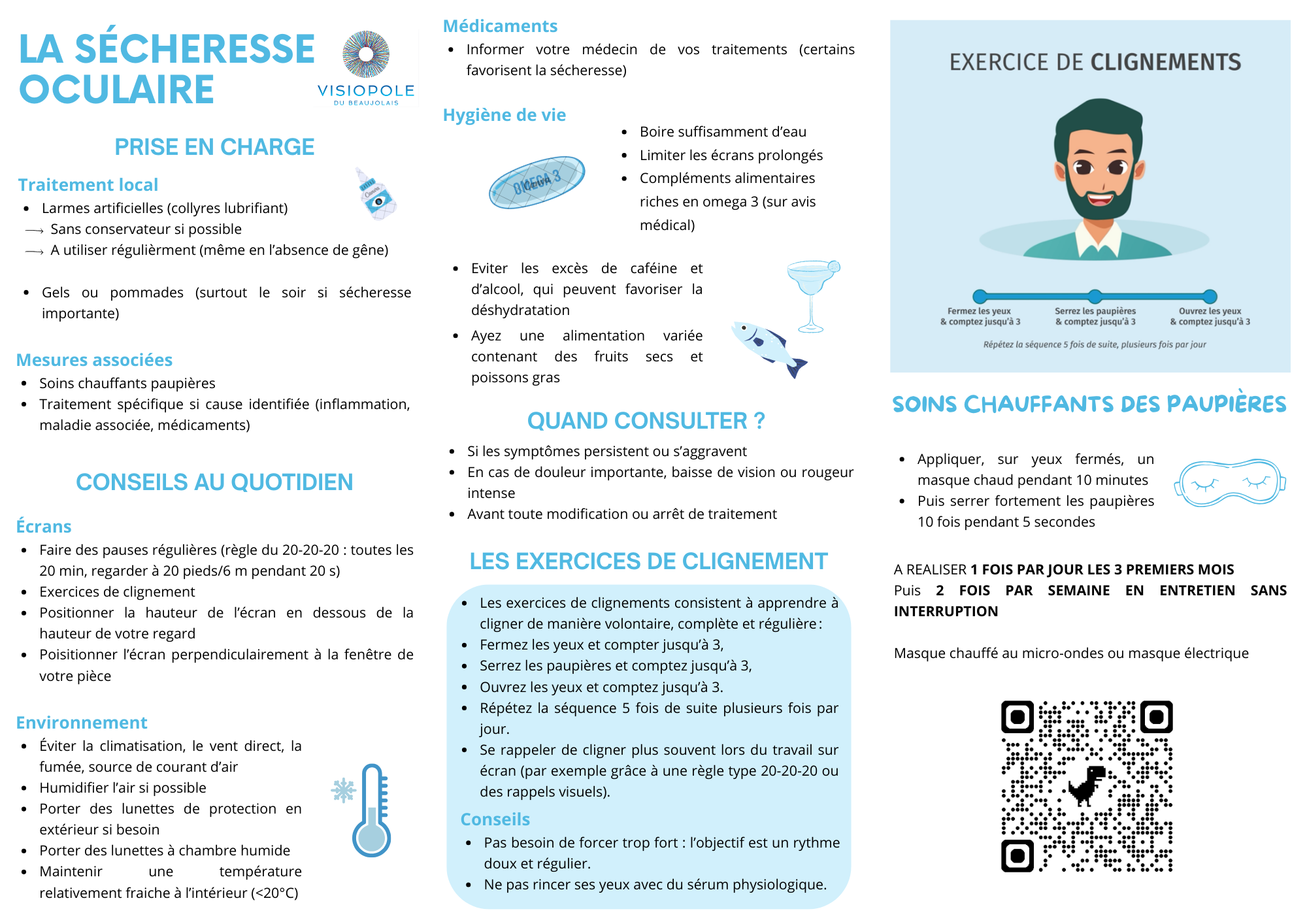 Le choix de ces traitements se fait au cas par cas, après un bilan diagnostique complet. Ils sont souvent associés aux mesures de base (substituts lacrymaux, hygiène palpébrale, prise en charge des facteurs favorisants) pour obtenir un contrôle durable de la sécheresse oculaire.